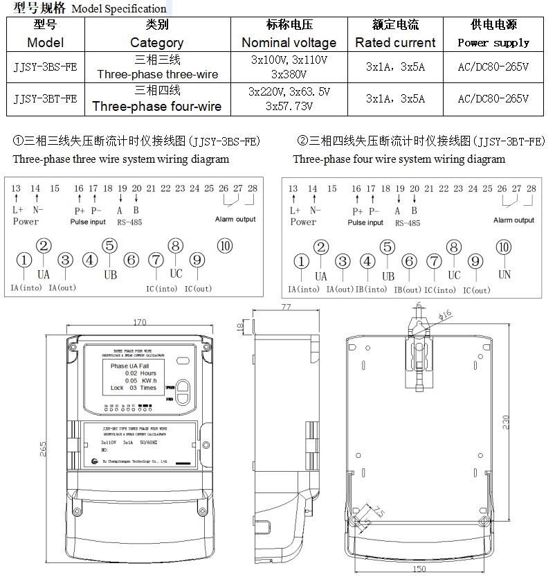JJSY系列三相失壓斷流計(jì)時(shí)儀適用于電力三相三線、三相四線系統(tǒng),通過對(duì)電網(wǎng)電壓(PT)回路、電流(CT)回路進(jìn)行監(jiān)視,能準(zhǔn)確判斷電網(wǎng)運(yùn)行狀態(tài),并詳細(xì)記錄其處于故障期間的各種參數(shù),以便供電部門對(duì)電網(wǎng)進(jìn)行管理,追補(bǔ)人為或非人為的漏計(jì)電能。 全英文菜單