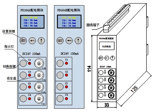 PD104系列直流配電控保模塊是DC24V直流配電系統(tǒng)控制保護(hù)模塊,以下簡(jiǎn)稱(chēng)模塊,該模塊具備1路輸入、4路輸出控制電源,同時(shí)OLED液晶實(shí)時(shí)顯示4路電流值。