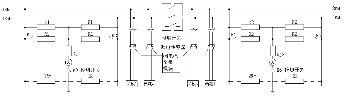 通過(guò)母線橋式比較電路及乒乓輔助判斷電路,準(zhǔn)確計(jì)算出直流母線正負(fù)極對(duì)地絕緣電阻(單母線絕緣降低或雙母線平衡絕緣降低),支路霍爾傳感器漏電流監(jiān)測(cè),并給出不同信號(hào),為直流系統(tǒng)故障分析提供依據(jù)。測(cè)量回路投入或退出可遙控投切(K3,K6)。