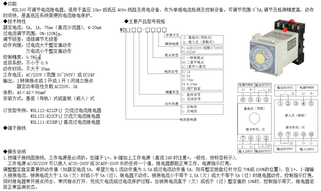 WDL100可調(diào)節(jié)電流繼電器,適用于高壓10kv或低壓400v線路及用電設(shè)備,作為單相電流檢測(cè)及控制設(shè)備。可調(diào)節(jié)范圍0~5A,調(diào)節(jié)及檢測(cè)精度高,動(dòng)作時(shí)間快,是高低壓系統(tǒng)簡(jiǎn)便可靠的電流繼電保護(hù)。