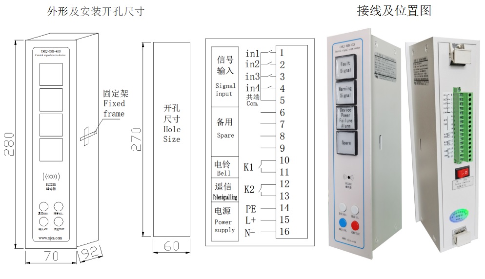 7.接點輸出:2個繼電器接點輸出,分別對應報警音響接點、報警遙信接點。