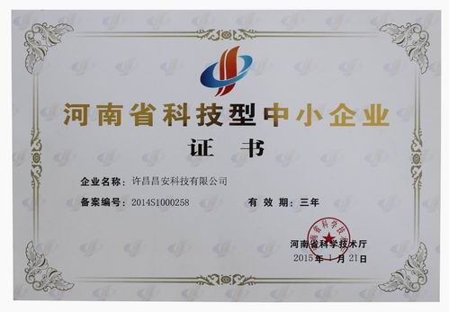 2015年1月21日,許昌昌安科技有限公司被河南省科學(xué)技術(shù)廳認(rèn)定為“河南省科技型中小企業(yè)”,并頒發(fā)證書(shū)。